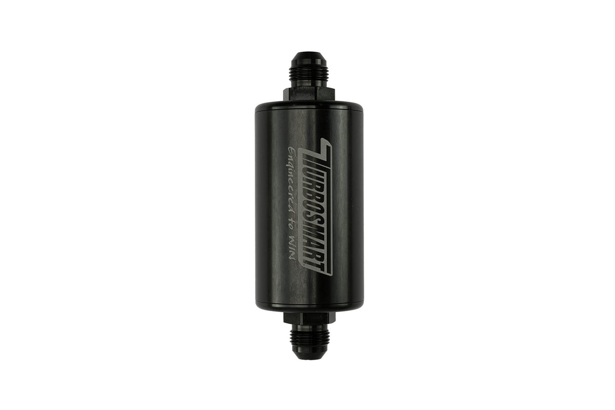 Turbosmart Motorsport Proven Billet Inline Fuel Filter with 10-micron washable stainless steel mesh cartridge.