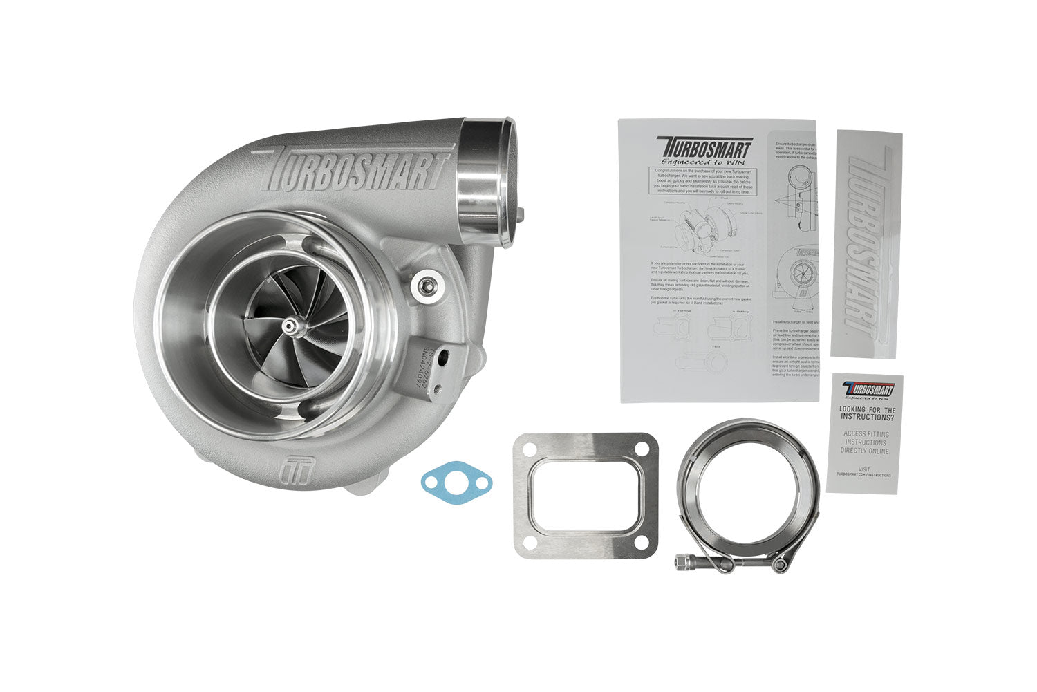 Every Turbosmart turbocharger comes standard with everything you need for installation, weld flanges, V-band clamps, gaskets, oil feed and drain fittings as well as water feed and return fittings are included.